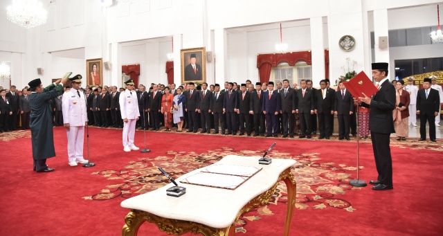 “Demi Allah, saya bersumpah akan memenuhi kewajiban saya sebagai gubernur/wakil gubernur dengan sebaik-baiknya dan seadil-adilnya, memegang teguh Undang-Undang Dasar Negara Republik Indonesia Tahun 1945, dan menjalankan segala undang-undang dan peraturannya dengan selurus-lurusnya, serta berbakti kepada masyarakat, nusa, dan bangsa,” demikian Presiden memimpin pengucapan sumpah jabatan.