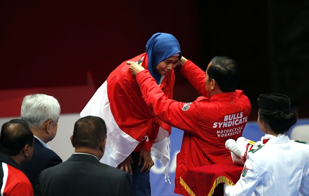 Momen bersejarah pun terjadi ketika Presiden RI mengalungkan medali emas kepada Defia. “Perasaan saya benar-benar semringah, sangat bangga, dan senang. Terima kasih untuk warga Indonesia yang telah mendukung saya. Indonesia bisa,” singkat Defia, yang bakal menerima hadiah sebesar Rp1,5 miliar atas keberhasilannya meraih medali emas di Asian Games 2018. [Mel/Nin]