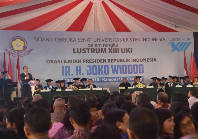JAKARTA, Kompasmadura.com -‘ Saat memberikan orasi ilmiah dalam Sidang Terbuka Senat Universitas Kristen Indonesia (UKI) dalam rangka Lustrum XIII UKI di Kampus UKI, Jakarta Timur, Senin, 15 Oktober 2018, Presiden Joko Widodo mengingatkan kembali sebuah pesan moral yang disampaikan dalam pidato di Pertemuan Tahunan IMF-Bank Dunia 2018 di Bali beberapa waktu yang lalu.