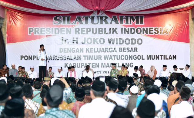 Hal tersebut disampaikan Presiden Joko Widodo saat bersilaturahmi dengan keluarga besar Pondok Pesantren (Ponpes) Darussalam Timur, Watucongol, Kabupaten Magelang, Provinsi Jawa Tengah, pada Sabtu, 23 Maret 2019.