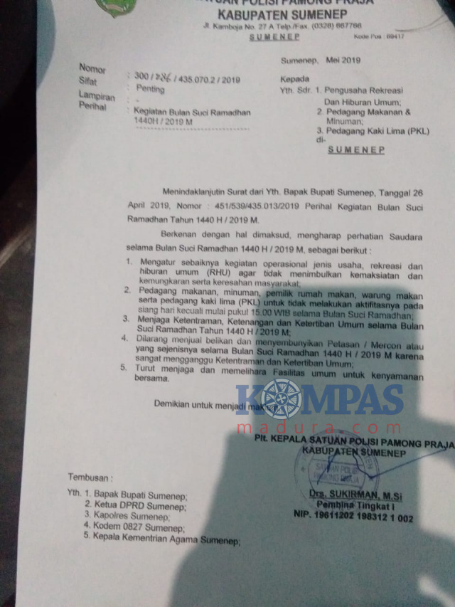 SUMENEP, Kompasmadura.com – Sesuai surat edaran yang dilayangkan Bupati Sumenep, Busyro Karim, bahwa kegiatan berjualan secara terbuka di bulan suci ramadhan ditutup, kecuali pukul 15.00 WIB sore hari.