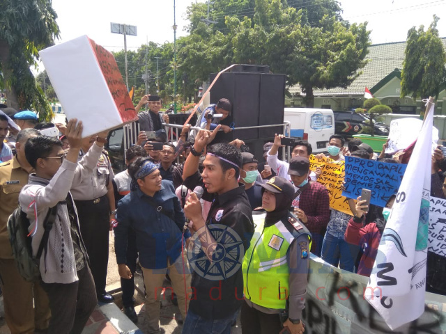 SUMENEP, Kompasmadura.com – Sejumlah aktivis mahasiswa yang tergabung dalam Ikatan Mahasiswa Kangean Sumenep (IMKS) Madura, Jawa Timur, melakukan aksi demo di depan kantor DPRD setempat, Senin (26/8/2019).