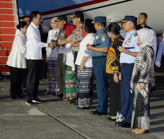 Setibanya di Bandar Udara Pattimura, Kota Ambon, Provinsi Maluku, sekitar pukul 19.13 WIT, Presiden Jokowi disambut oleh Gubernur Maluku Murad Ismail, Pangdam XVI/Pattimura Mayjen TNI Marga Taufiq, Kapolda Maluku Irjen Royke Lumowa, dan Panglima Koarmada III Laksda TNI I Nyoman Gede Ariawan, masing-masing beserta istri.