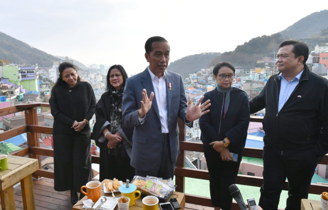 “Ya ini sore-sore kita jalan diajak Pak Dubes dan Ibu Menteri Luar Negeri untuk melihat Kampung Gamcheon. Ini adalah penataan kampung yang sebelumnya kumuh, kemudian dilakukan pengecatan, tetapi juga kegiatan pemberdayaannya diisi,” kata Presiden Jokowi.