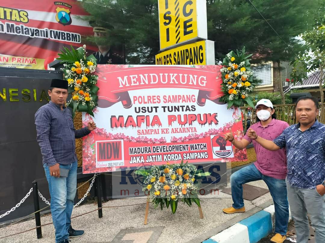 Karangan bunga yang diletakkan di depan halaman Mapolres Sampang, sebagai bentuk apresiasi dan dukungan terhadap Aparat Penegak Hukum (APH) dalam mengungkapkan kasus mafia pupuk di kota Bahari. Menurutnya, bagaimana kasus ini tidak mandek di jalan, karena persoalan kasus pupuk bukan terjadi sekali di Sampang.