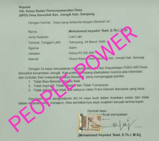 Dalam suratnya, Ketua P2KD PAW Desa Bancelok Muhammad Irsyadul ‘Ibad menyampaikan alasan. Yakni, disebabkan karena adanya intimedasi dan ada tuntutan dari masyarakat Desa Bancelok yang menganggap panitia.