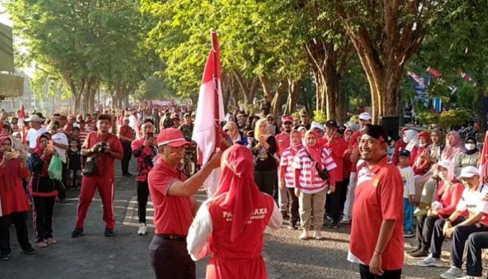 Bupati Sumenep, Achmad Fauzi Wongsojudho, SH, MH, didampingi Ketua TP PKK Kabupaten Sumenep, Nia Kurnia Fauzi, melepas kirab bendera merah putih dan Jalan-jalan Sehat (JJS) HUT Kemerdekaan RI ke-78 dengan start di depan RRI di Jl. Urip Sumoharja No.35, Mastasek, Pabian, Kecamatan Kota. Minggu (27/8/2023).