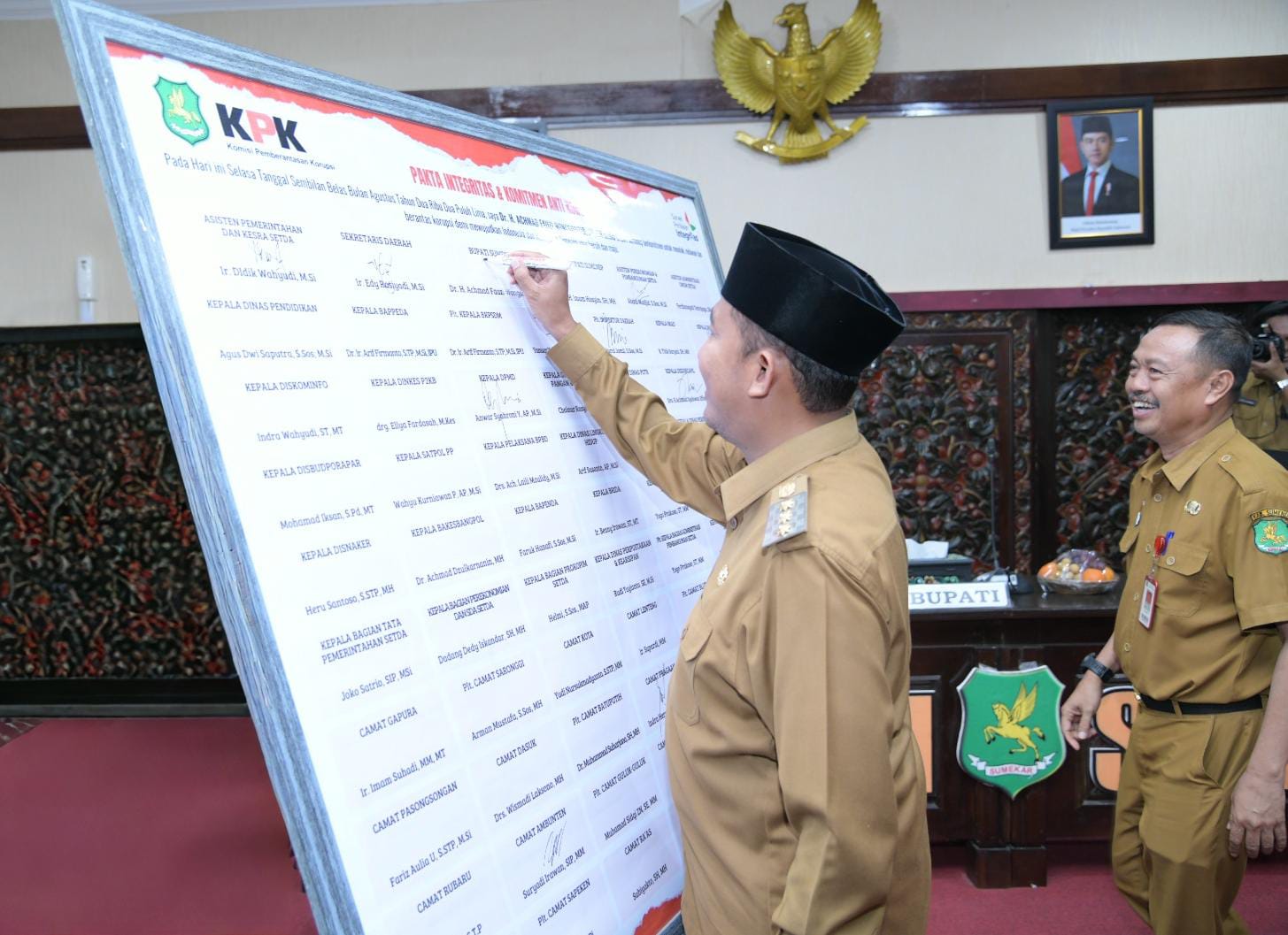 Sementara penandatanganan secara simbolis pakta integritas dan komitmen antikorupsi di di kabupaten Sumenep dilakukan oleh Bupati Sumenep, Sekretaris Daerah bersama sejumlah kepala OPD, Bagian dan para Camat.(Ida/Nin)